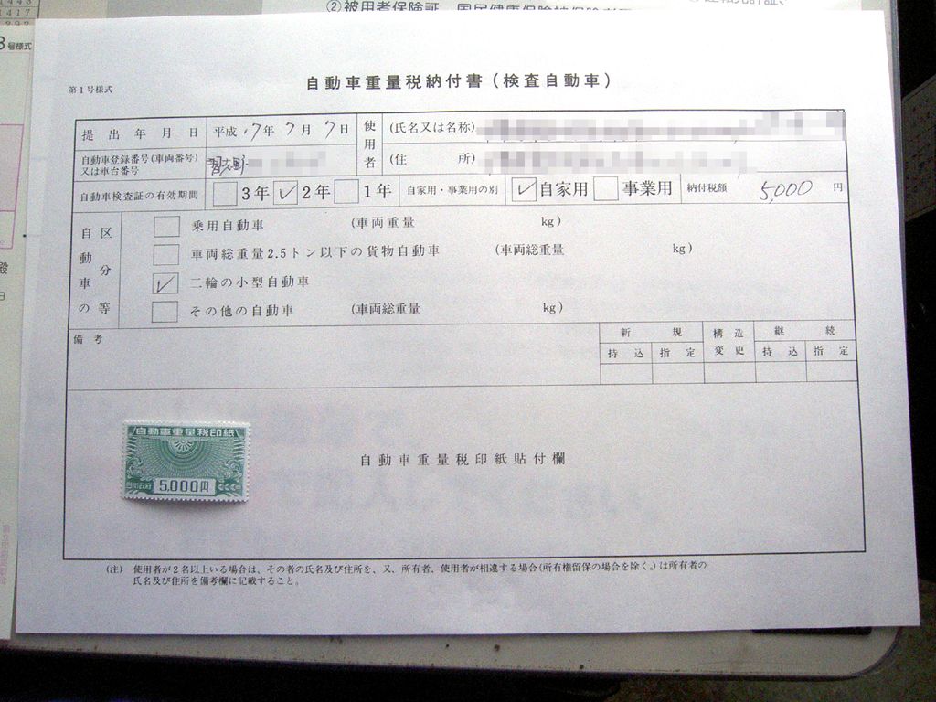 3.車検場へGO! 車検は、午前と午後に分かれていますが、午前は11時半まで(だったかな?)なので、書類の記入時間や、忘れ物をした時の事を考えて早目に行きましょう。車検に際して必要な書類のうち、陸運局で購入するのは以下の3つです。 ・自動車検査票 ・継続検査申請書 ・自動車重量税納付書 窓口で「自動二輪の車検に必要な書類を下さい」と言えば、30円で売ってくれます。書類を購入し、必要事項を記入したら、検査手数料と重量税の支払いに使用する収入印紙を購入し、書類に貼り付けます。書類の準備が出来たら、以下の4つの書類と纏めて、検査受付窓口に提出します。 ・車検証 ・自賠責保険証 ・自動車税納税通知書(領収書) ・定期点検記録簿 なお、書類ではありませんが、”印鑑”も必要になりますので、忘れずに持っていってください。 窓口での受付が済んだら、すぐに検査ラインに入ります。検査ラインでは、まず機械を使わず、検査員の方が次の検査を行います。 ・ウインカー ・ホーン ・ブレーキランプ ・車体番号確認 ・エンジン形式確認 ・各部締め付け確認(柄の長い金槌のようなもので軽く叩いて緩みを確認します) ※消音装置の音量測定等はマフラーを変更している場合のみ実施 検査員による検査が終了したら、次に機械による検査が行われます。 ・スピードメーター(習志野は速度が40kmを指した時点でスイッチを離す) ・ブレーキ(前・後) ・ライト(ハイビームでの明るさ・光軸ぶれの確認) ライトの検査が終了したら・・・え?終わり?? そう、これで終わりです。あとは、出口で検査合格印をもらって再び受け付け窓口に提出したら、ものの10秒で新しい車検証を渡してくれます。 新しい車検証とともにステッカーが渡されるので、ナンバープレートに新しいステッカーに張り替えて車検終了!です。どうです、簡単でしょ?
